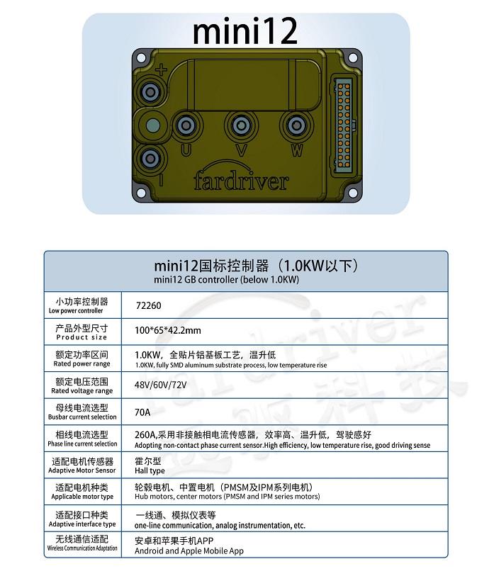 MINI12 72V70A 500-2000W 48V/60V/72V EV Progammable FOC Controller Fardriver Brand For Electric Scooter. Electric Bicycle